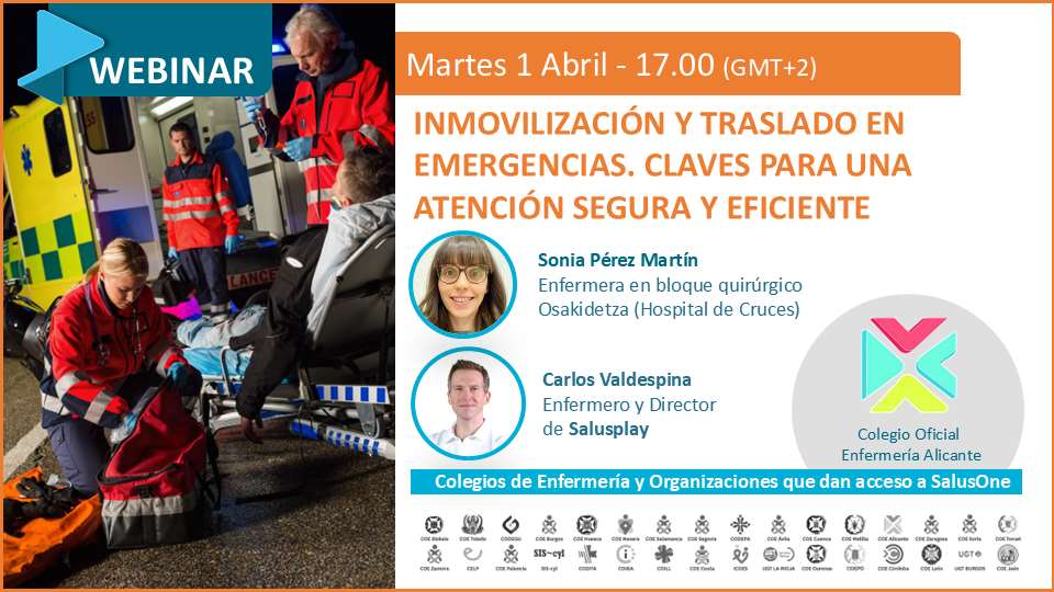 El martes 1 de abril a las 17:00h (hora peninsular) tendrá lugar un nuevo webinar de conocimiento titulado “Inmovilización y traslado de emergencias. Claves para una atención segura y eficiente”, proporcionado por el Área de Formación del Colegio de Enfermería de Alicante, coordinada por el vocal V de la Junta de Gobierno, Juan José Tarín Sáez, a través de la plataforma de formación online SalusOne.