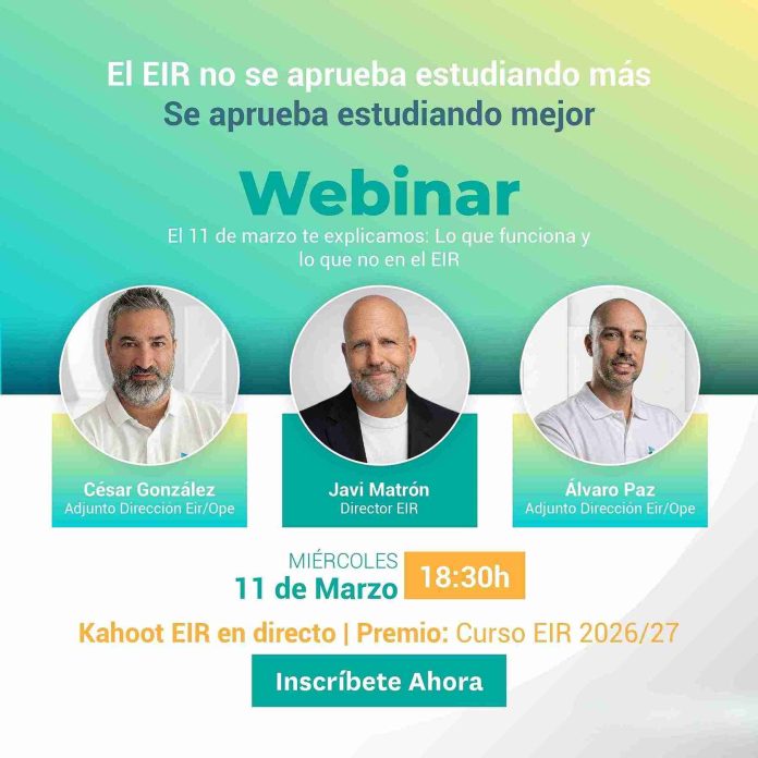 El webinar está dirigido a aquellos/as colegiados/as que estén pensando en presentarse al EIR 2026 y quieran conocer qué tecnicas de estudio funcionan a la hora preparar el examen EIR.