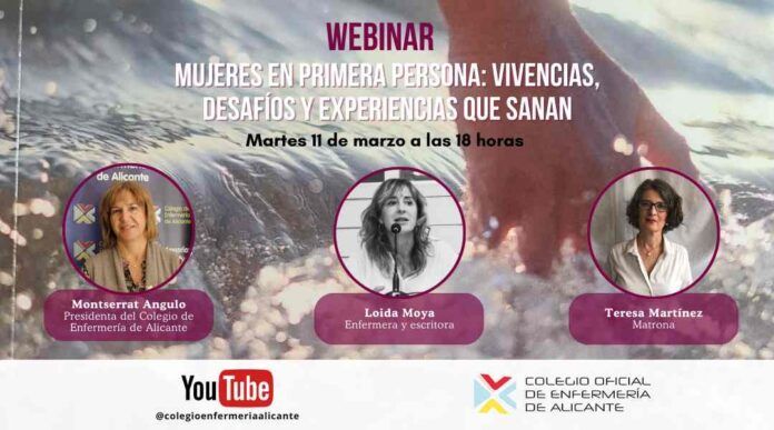 El Colegio de Enfermería de Alicante va a celebrar el martes 11 de marzo, a las 18 horas, el webinar titulado “Mujeres en primera persona: vivencias, desafíos y experiencias que sanan”, que podrás seguir en directo a través del canal de YouTube del Colegio, accediendo desde este enlace.