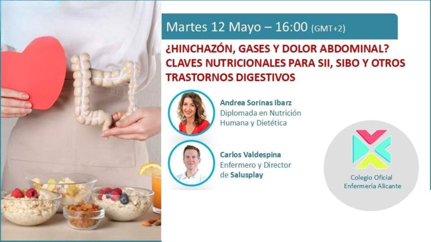 El área de Formación del Colegio de Enfermería de Alicante, coordinada por el vocal V de la Junta de Gobierno, Juan José Tarín Sáez, pone a tu disposición un nuevo webinar titulado “¿Hinchazón, gases y dolor abdominal? Claves nutricionales para SII, SIBO y otros trastornos digestivos”, que tendrá lugar el martes 12 de mayo a las 16:00.