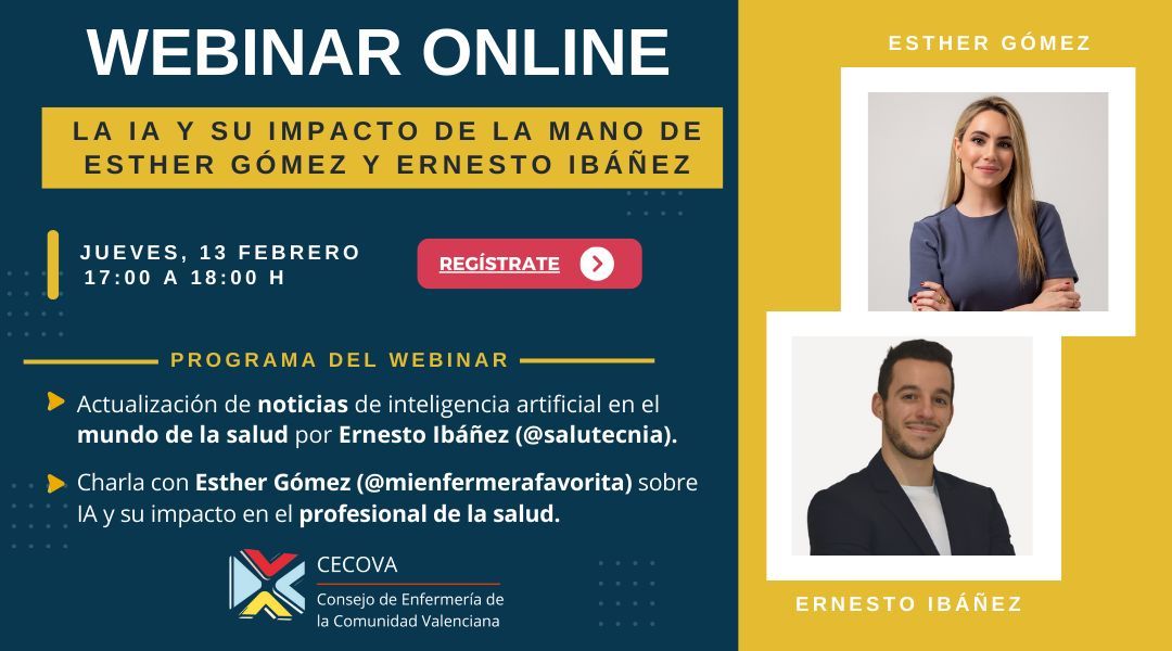 El Consejo de Enfermería de la Comunidad Valenciana (CECOVA), en colaboración con los colegios de Enfermería de Alicante, Castellón y Valencia, va a celebrar el próximo 13 de febrero, de 17 a 18 h., un webinar titulado “IA y su impacto de la mano de Esther Gómez y Ernesto Ibáñez”.