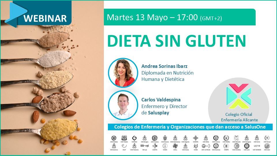 El martes 13 de mayo, a las 17:00h, tendrá lugar un nuevo webinar de alimentación titulado “Dieta sin gluten”, proporcionado por el Área de Formación del Colegio de Enfermería de Alicante, coordinada por el vocal V de la Junta de Gobierno, Juan José Tarín Sáez, a través de la plataforma de formación online SalusOne.