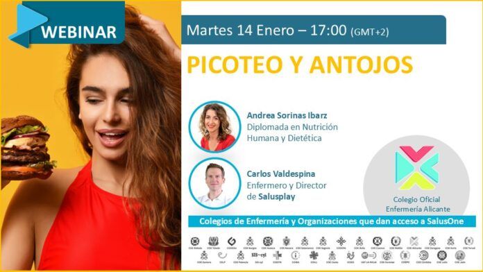 El próximo martes 14 de enero a las 17:00h (hora peninsular) tendrá lugar un nuevo webinar titulado “Picoteo y antojos”, proporcionado por el Área de Formación del Colegio de Enfermería de Alicante, coordinada por el vocal V de la Junta de Gobierno, Juan José Tarín Sáez, a través de la plataforma de formación online SalusOne.