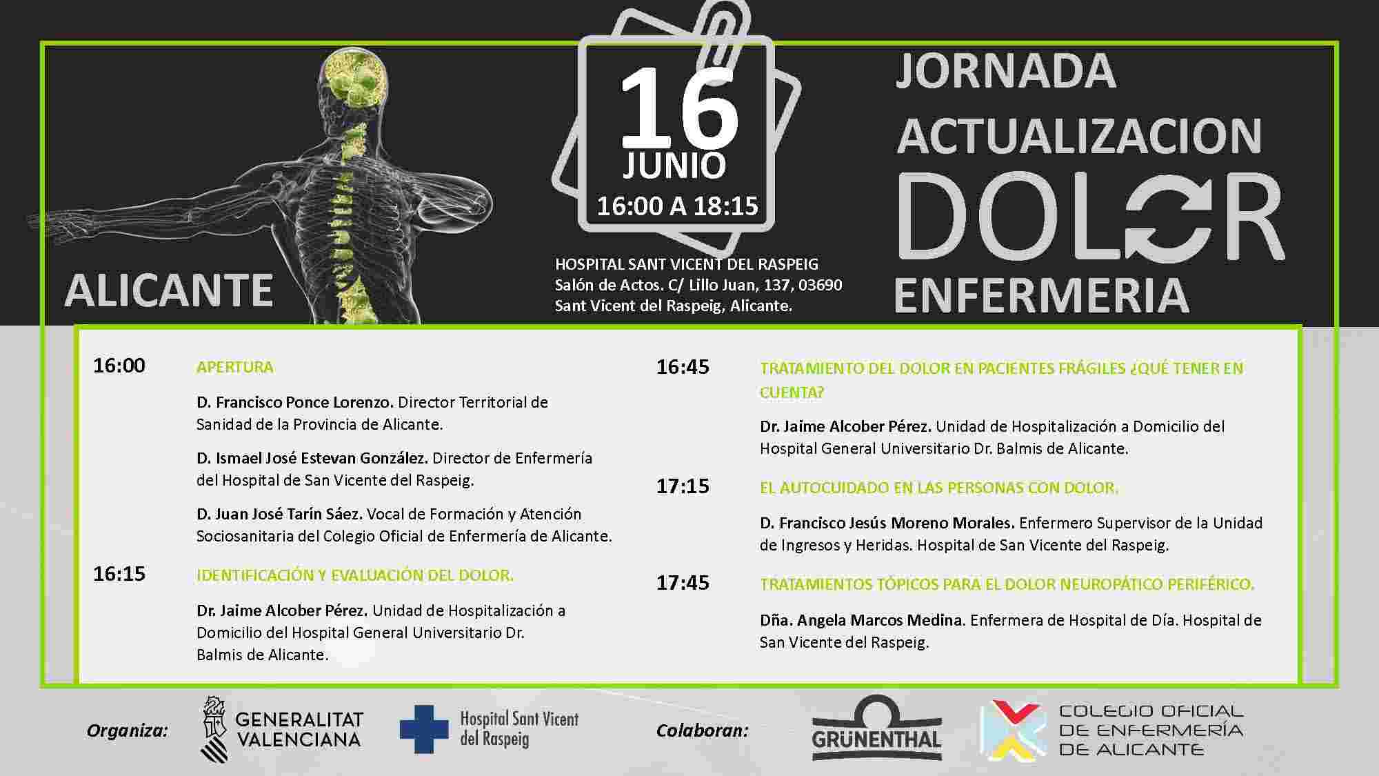 El Hospital de Sant Vicent del Raspeig acogerá el próximo 16 de junio la Jornada de actualización sobre el dolor para Enfermería, organizada por el Hospital de Sant Vicent del Raspeig, en colaboración con el Colegio Oficial de Enfermería de Alicante y Grunenthal. El evento, que se desarrollará de 16:00 a 18:15 en el Salón de Actos del centro sanitario, reunirá a profesionales del ámbito médico y de Enfermería con el objetivo de profundizar en los últimos avances y enfoques terapéuticos relacionados con el tratamiento del dolor.