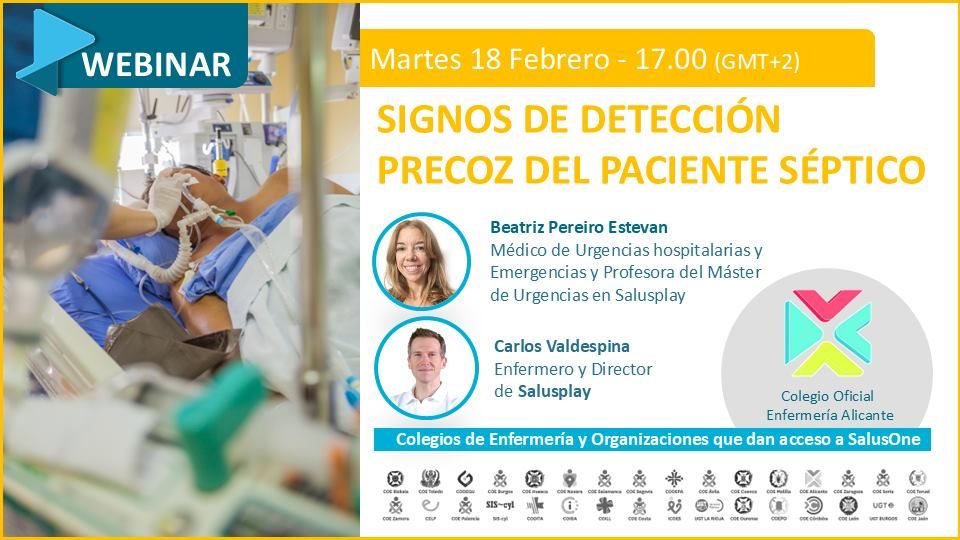 El martes 18 de febrero a las 17:00h (hora peninsular) tendrá lugar un nuevo webinar de conocimiento titulado “Signos de detección precoz del paciente séptico”, proporcionado por el Área de Formación del Colegio de Enfermería de Alicante, coordinada por el vocal V de la entidad, Juan José Tarín Sáez, a través de la plataforma de formación online SalusOne.