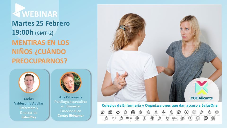 El martes 25 de febrero a las 19:00h (hora peninsular) tendrá lugar un nuevo webinar de la Escuela de padres y madres titulado “Mentiras en los niños. ¿Cuándo preocuparnos?”, proporcionado por el Área de Formación del Colegio de Enfermería de Alicante, coordinada por el vocal V de la entidad, Juan José Tarín Sáez, a través de la plataforma de formación online SalusOne.