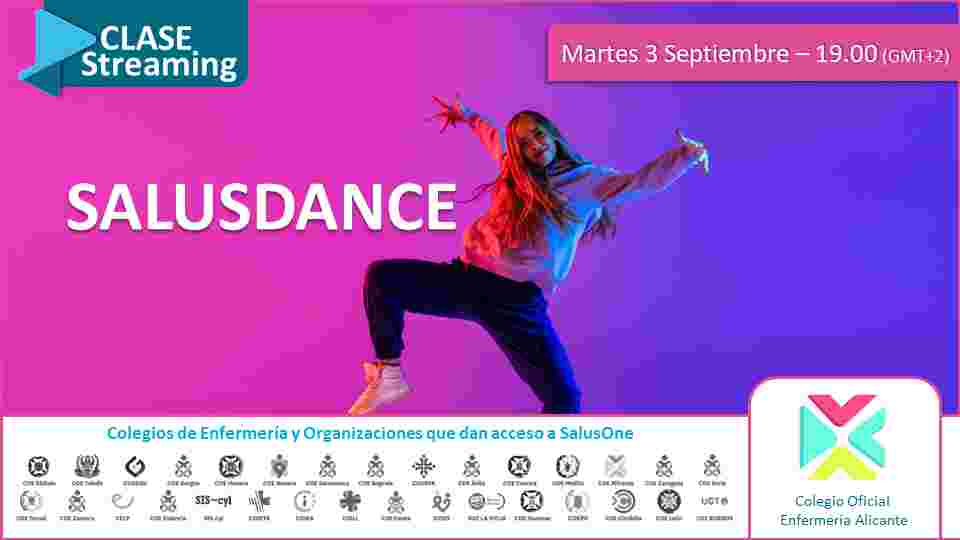 El Colegio de Enfermería de Alicante, mediante su Área de Formación, coordinada por el Vocal V de la entidad, Juan José Tarín, pone a tu disposición, mediante la plataforma SalusOne, una nueva clase de Streaming GYM de Salusdance. Tendrá lugar el próximo martes 3 de septiembre a las 19:00h.