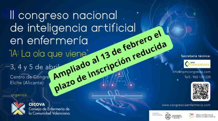 El Consejo de Enfermería de la Comunidad Valenciana (CECOVA) ha ampliado al 13 de febrero la fecha de la cuota reducida para poder inscribirse en el II Congreso Nacional de Inteligencia Artificial en Enfermería, que tendrá lugar en Elche entre los días 3 y 5 de abril de 2025.