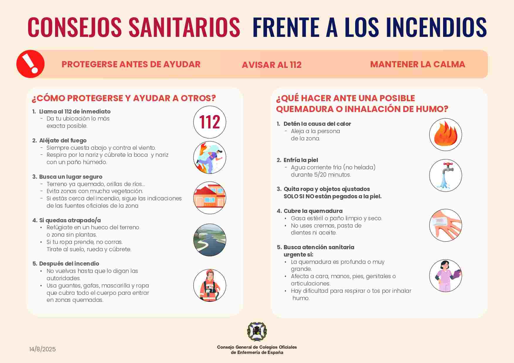 Además, el organismo que representa a las más de 353.000 enfermeras y enfermeros de España, a través de su Instituto Español de Investigación Enfermera, quiere poner a disposición de toda la población una serie de consejos de prevención, así como de actuación en caso de encontrarse cerca o afectado por uno de estos incendios.