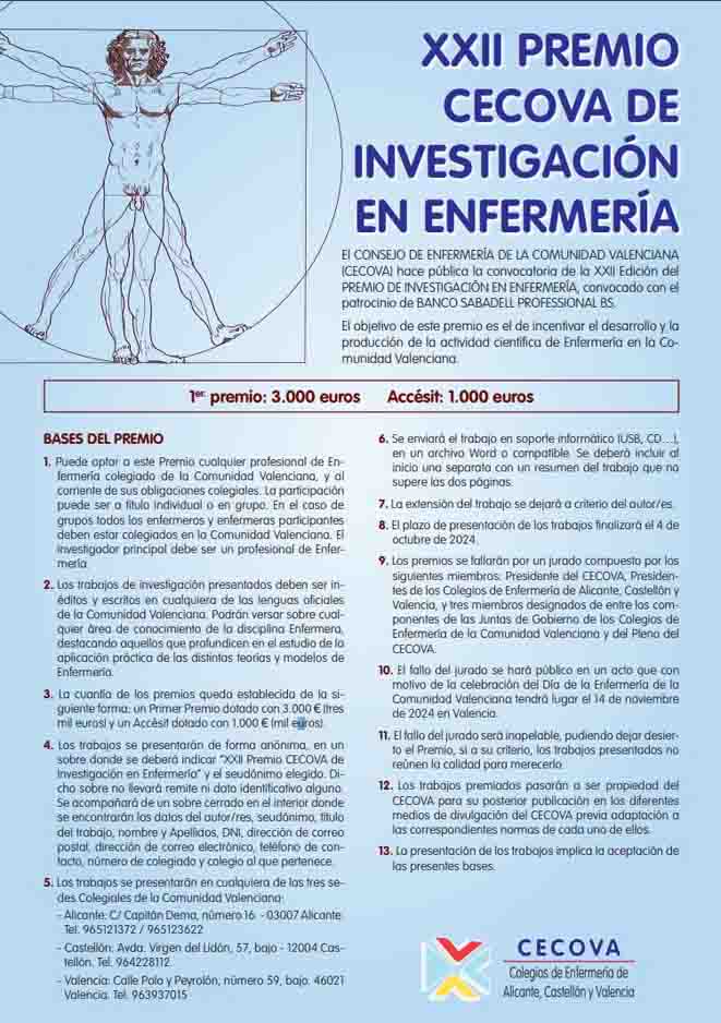 Quedan pocos días para que se cierre el plazo para presentar trabajos al XXII Premio CECOVA de Investigación en Enfermería, convocado con el patrocinio de BANCO SABADELL PROFESSIONAL BS. El objetivo de este premio es el de incentivar el desarrollo y la producción de la actividad científica de Enfermería en la Comunidad Valenciana.