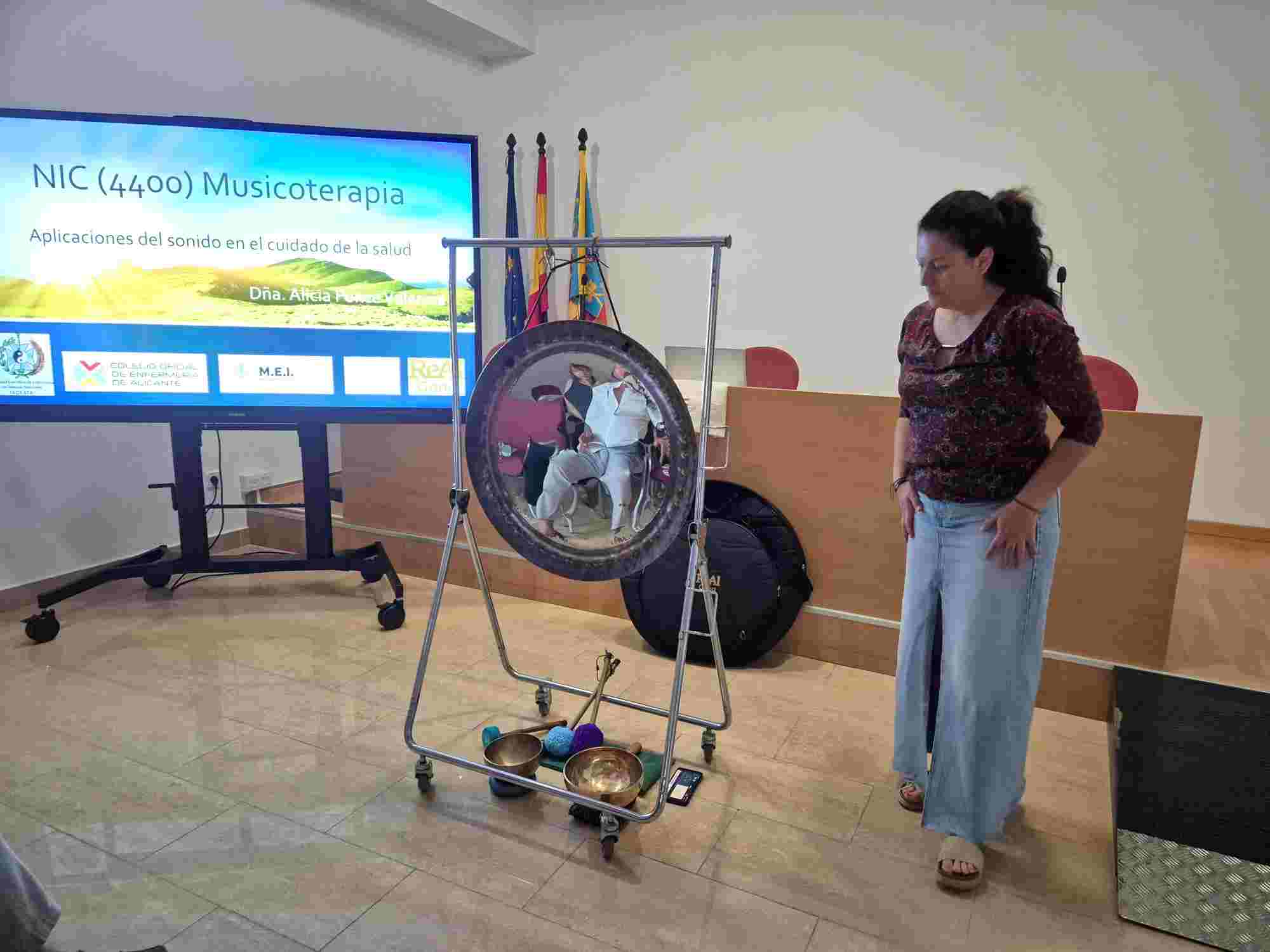 El Colegio de Enfermería de Alicante ha acogido el Seminario de Musicoterapia – NIC: 4400, organizado por ADEATA y en colaboración con el Colegio, el cual ha sido gratuito para todos sus colegiados/as. Una propuesta formativa innovadora centrada en el uso de la música —concretamente el gong— como herramienta terapéutica para el bienestar tanto de los profesionales sanitarios como de sus pacientes.
