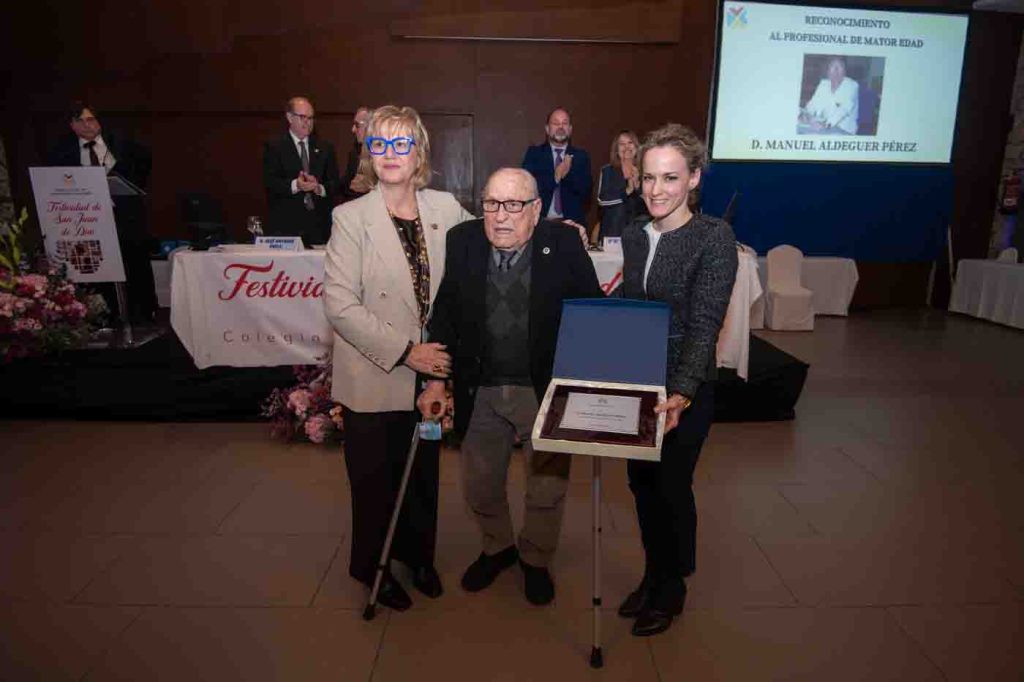 Manuel Aldeguer Pérez recibió el homenaje como Colegiado de más edad de la provincia de Alicante. La presidenta del Colegio de Enfermería de Alicante fue la encargada de glosar su figura realizando un emotivo repaso por la trayectoria personal y profesional de un compañero que ejerció la profesión con gran vocación y dedicación durante sus años de ejercicio.