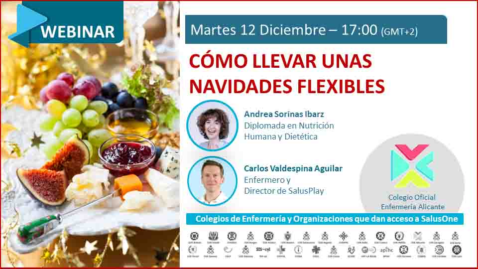 El Colegio de Enfermería de Alicante, a través de la vocalía V de la entidad, coordinada por Juan José Tarín, pone a tu disposición un nuevo webinar, mediante la plataforma SalusOne, el próximo martes 12 de diciembre a las 17:00h sobre alimentación, bajo el título de “Cómo llevar unas navidades flexibles”.