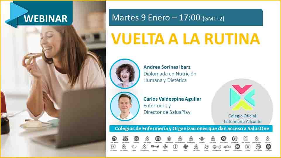 El Colegio de Enfermería de Alicante, a través de su vocalía V, cuyo responsable es Juan José Tarín, pone a tu disposición a través de la plataforma SlausOne un nuevo webinar titulado “Vuelta a la rutina” el próximo 9 de enero a las 17:00h. En este webinar, la nutricionista Andrea Sorinas dará sus recomendaciones para recuperar buenos hábitos alimenticios después de las fiestas navideñas.