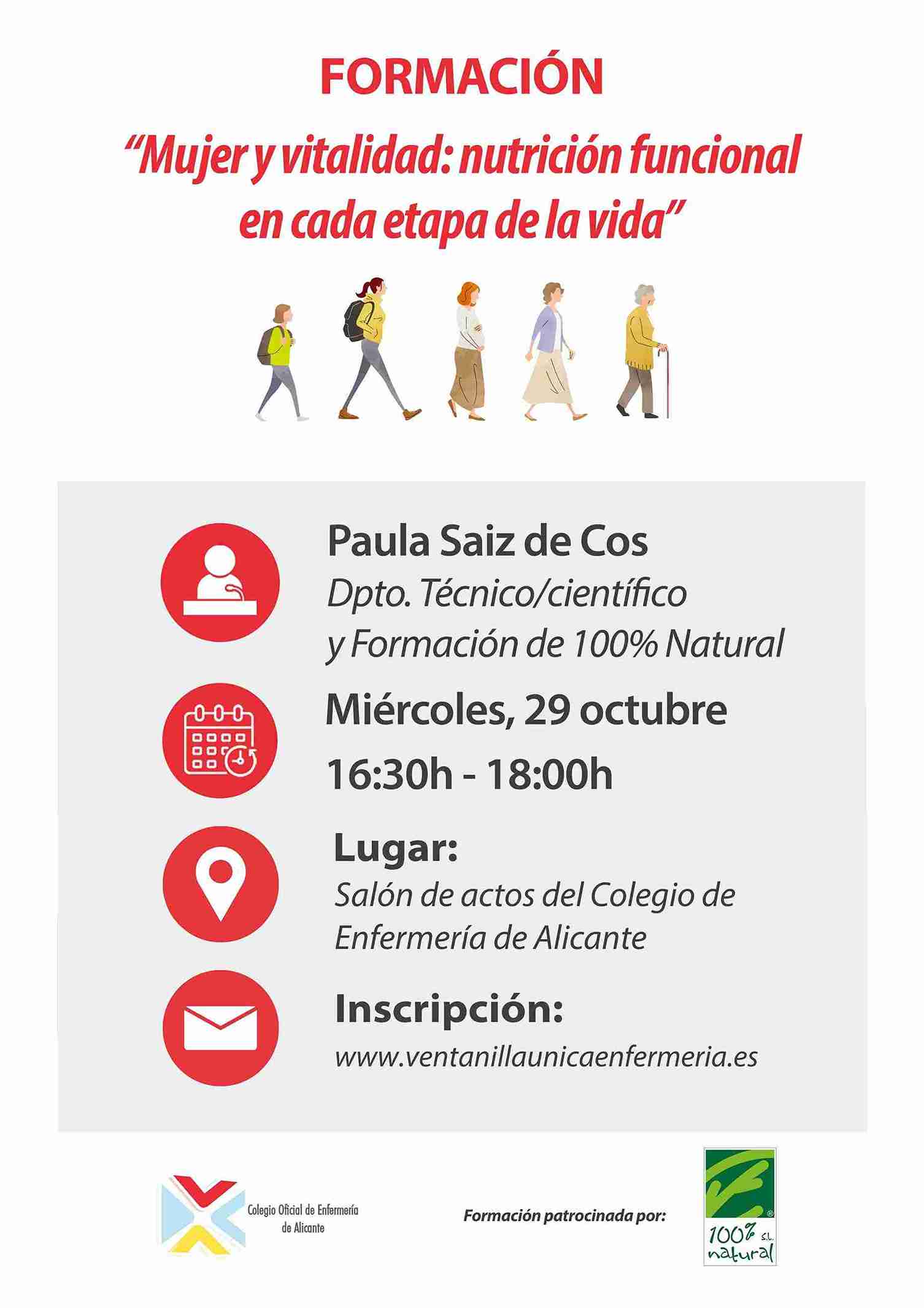 El Colegio de Enfermería de Alicante, en colaboración con el Laboratorio 100% Natural, impartirá la charla-formación gratuita “Mujer y vitalidad: Nutrición funcional en cada etapa de la vida” el día 29 de octubre, de 16:30 a 18:00h, en el Salón de actos del Colegio de Enfermería de Alicante. En ella, se abordará el papel fundamental que guarda la nutrición en el proceso de envejecimiento saludable de la mujer.