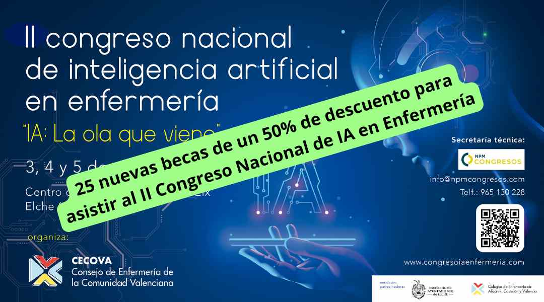 Dada la gran acogida que tuvieron las 25 becas para asistir al II Congreso Nacional de Inteligencia Artificial en Enfermería que se celebrará en Elche los próximos 3, 4 y 5 de abril organizado por el CECOVA, el Colegio de Enfermería de Alicante ha creído oportuno ofrecer otras 25 becas de un 50% de descuento de la cuota de inscripción de dicho evento.