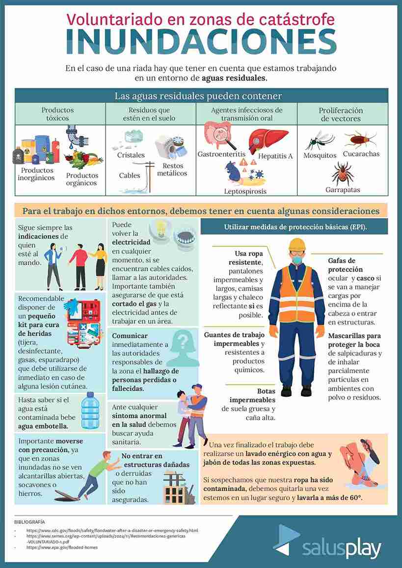 El Colegio de Enfermería de Alicante, a través de su Área de Formación coordinada por el vocal V de la Junta de Gobierno, Juan José Tarín Sáez, te ofrece esta infografía científica que ha confeccionado SalusPlay, con quien el Colegio tiene contratada parte de su formación continuada online. Una infografía con pautas para el voluntariado que está trabajando en zonas afectadas por la DANA.
