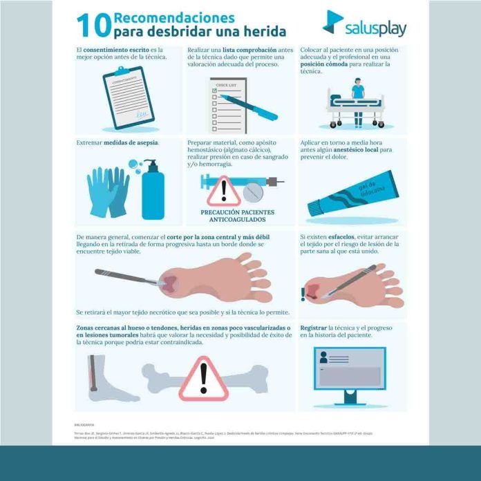 El Área de Formación del Colegio de Enfermería de Alicante, coordinada por el vocal V de la entidad, Juan José Tarín Sáez, te ofrece, mediante la plataforma online SalusOne, una nueva infografía basada en evidencias sobre “Cómo desbridar una herida”.