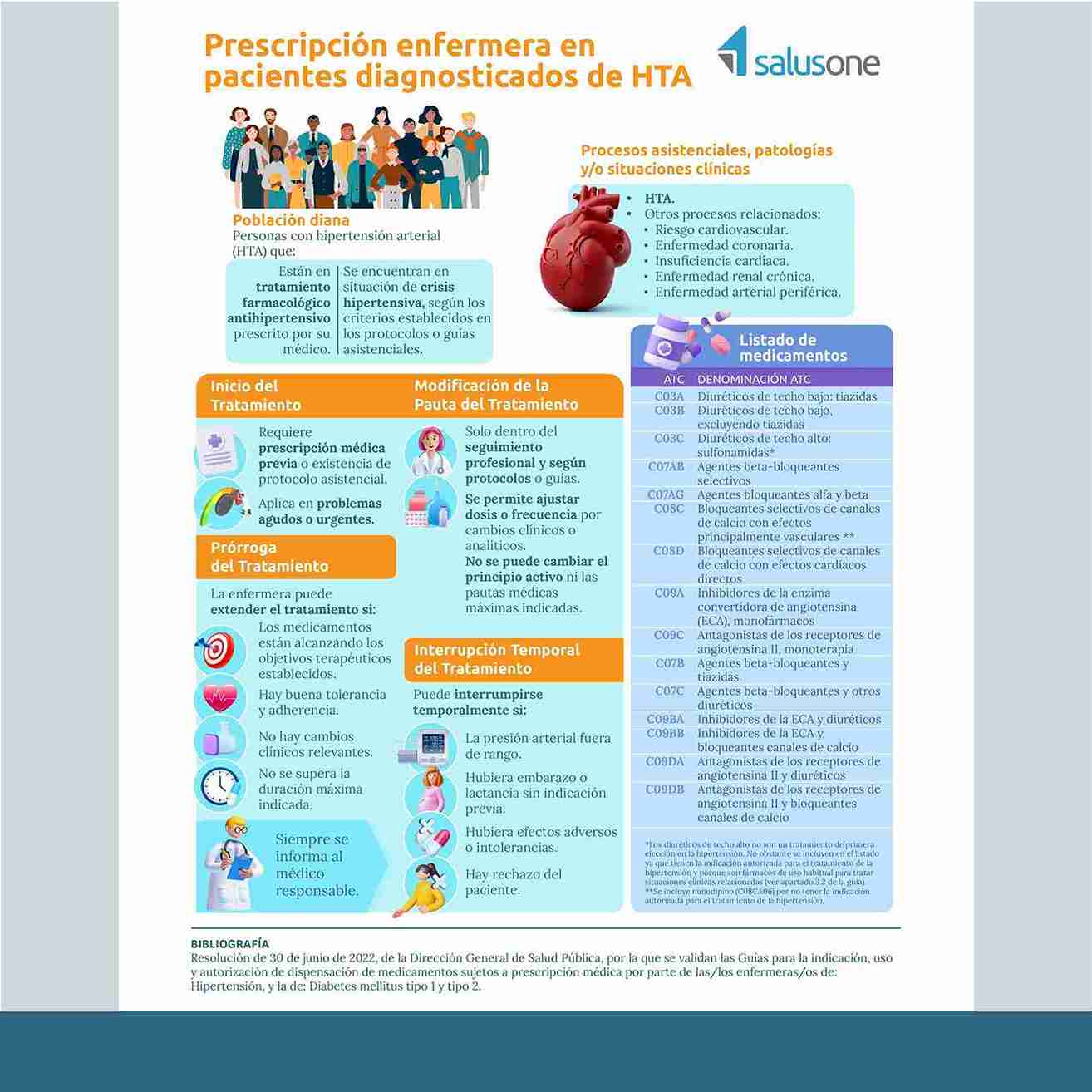 El Colegio de Enfermería de Alicante, mediante su Área de Formación coordinada por el vocal V de la entidad, Juan José Tarín Sáez, pone a tu disposición, a través de la plataforma de formación online, SalusOne, que tiene contratada el Colegio, una nueva infografía basada en evidencias sobre “Prescripción enfermera de medicamentos sujetos a prescripción médica para pacientes diagnosticados de HTA”.