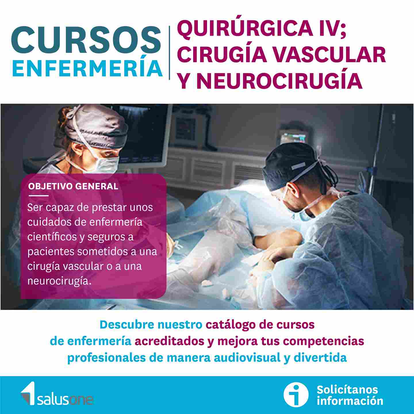 El Área de Formación del Colegio de Enfermería de Alicante, coordinada por el vocal V de la entidad, Juan José Tarín Sáez, te ofrece, mediante la plataforma online SalusOne, un nuevo Curso de Formación Continua (CFC) titulado “Enfermería quirúrgica IV; cirugía vascular y neurocirugía”.