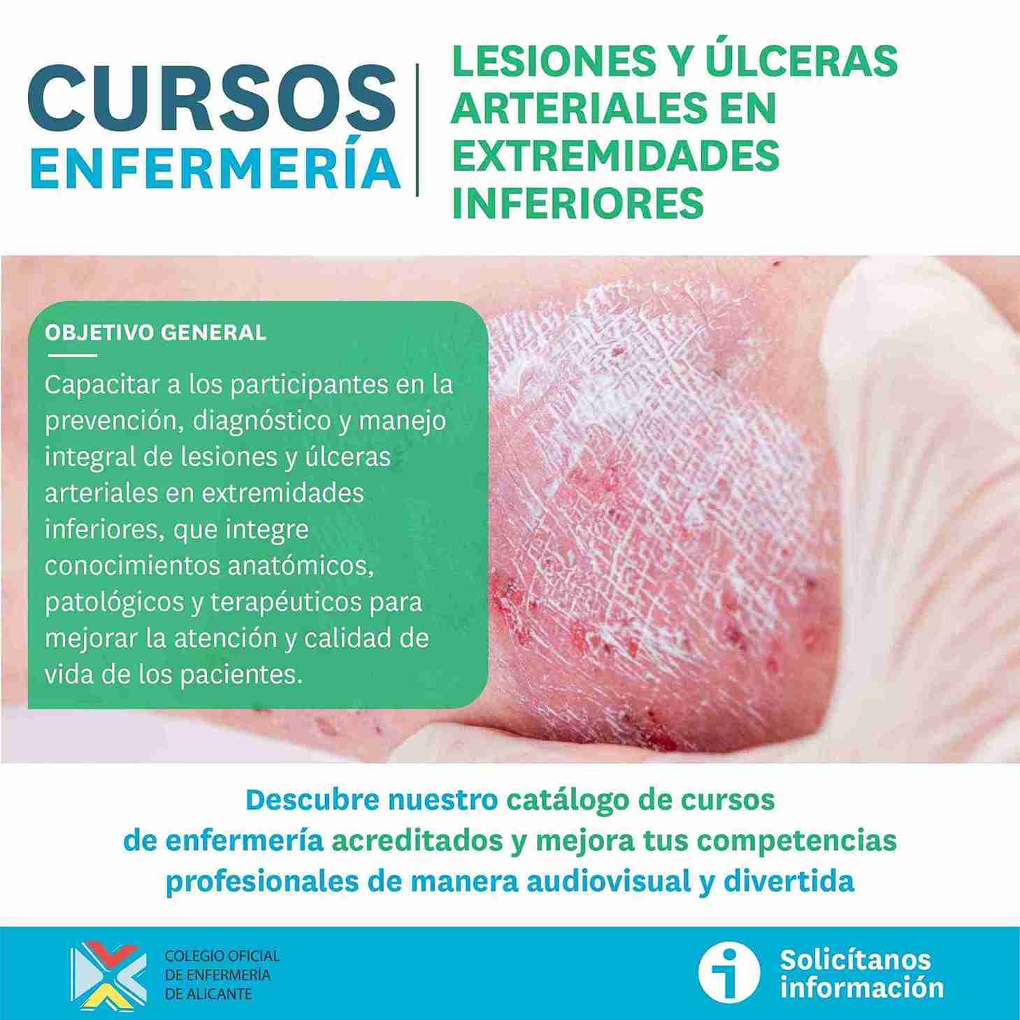 Desde el Área de Formación del Colegio de Enfermería de Alicante, coordinada por el vocal V, Juan José Tarín Sáez, te ofrecemos un nuevo Curso de Formación Continua (CFC) online titulado “Lesiones y úlceras arteriales en extremidades inferiores”.