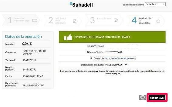 El proceso de matriculación no estará finalizado en el último paso hasta que una vez realizado el pago no se haga click en el botón «Continuar» que aparece recuadrado en rojo en la captura de pantalla inferior.