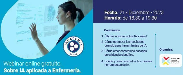 El Colegio de Enfermería de Alicante, a través del CECOVA continúa su compromiso con la actualización y formación constante de los profesionales de enfermería. Este 21 de diciembre, te invitamos al nuevo webinar mensual sobre Inteligencia Artificial (IA) aplicada a la Enfermería.