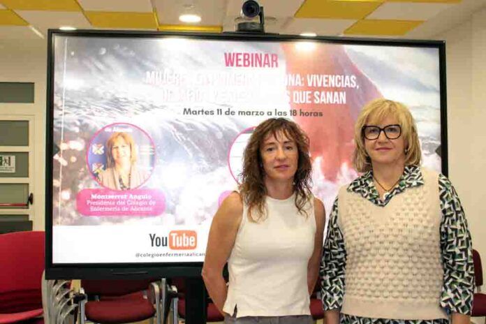 El Colegio de Enfermería de Alicante ha celebrado el webinar “Mujeres en primera persona: vivencias, desafíos y experiencias que sanan”, actividad que contó con la participación de la enfermera y escritora Loida Moya y que fue presentada por la presidenta del Colegio de Enfermería de Alicante, Montserrat Angulo.